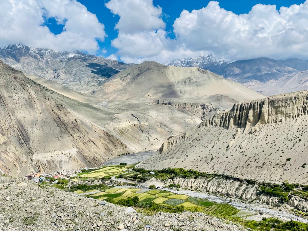 We had an early start leaving Pokhara in order to catch our flight to Jomsom. The prominent Annapurna range came into view as the clouds cleared. We enjoyed cappuccinos on the rooftop of the airport and watched parasail tours take off one after another.