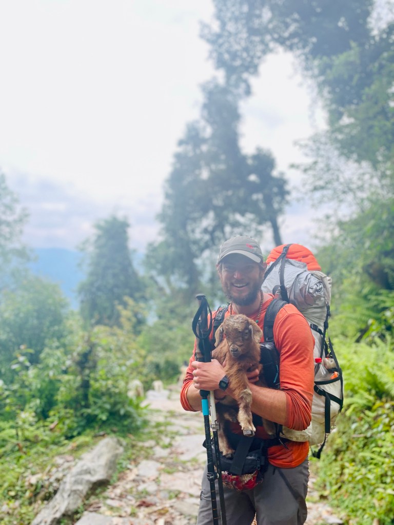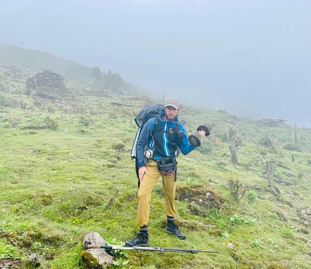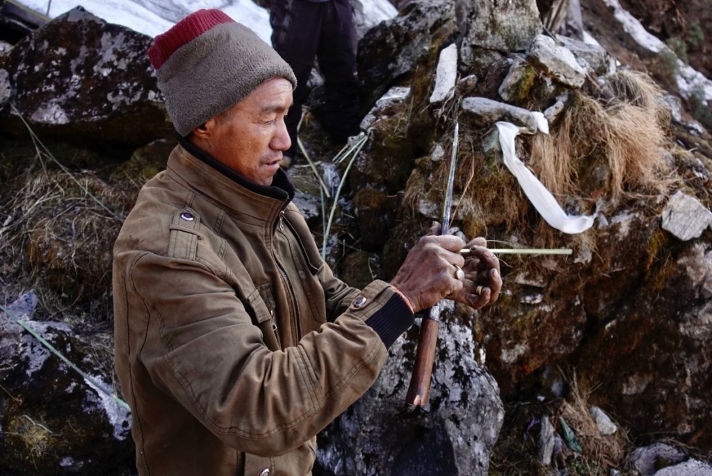 We said goodbye to some of the coolest porters we had met, Mingma and Nupu. Mingma, in his gold boots, the true Nepali woodsman. Nupu, the unstoppable, always moving and forging ahead to find the next section of trail. They both wore their gold rubber boots up snowy mountains without socks, started fires with wet wood during snowstorms, slept under rock slabs without a tent, grabbed metal pots with bare hands straight from the flames, and honed a Khukori to clear jungle paths and construct tools along the way. We watched as Mingma made a tumpline (a strap placed on the forehead) in a matter of minutes, slicing bamboo into thin strands and weaving it with Nupu so they could more easily carry their loads. Another time making a spear just in case we came across an aggressive bear.