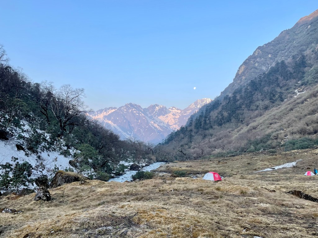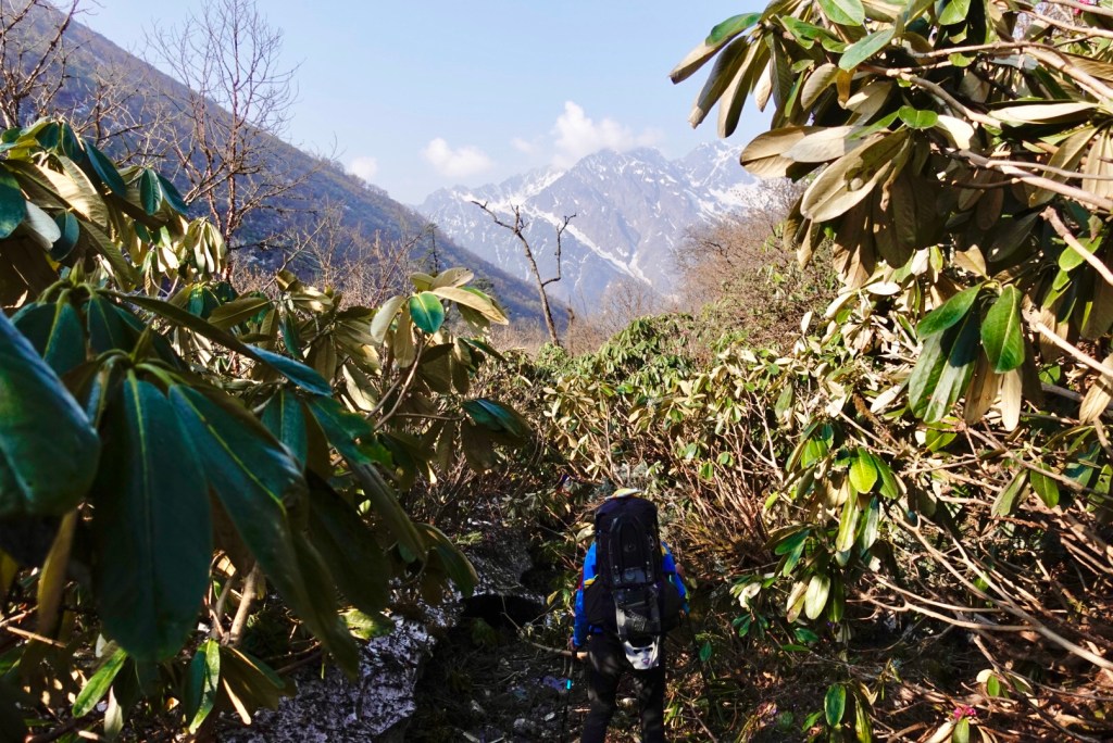 The morning was peaceful, with a beautiful view of the moon setting over the mountains. The peace was soon interrupted by a trail that turned into an obstacle course of Rhododendron and bamboo. Our snowshoes that we strapped to our packs were constantly getting caught in branches. The snow had just melted and slippery bamboo sticks covered the trail for most of the day. Mingma was in front and was slashing through what he could, but much of the time it was quicker just to push through.