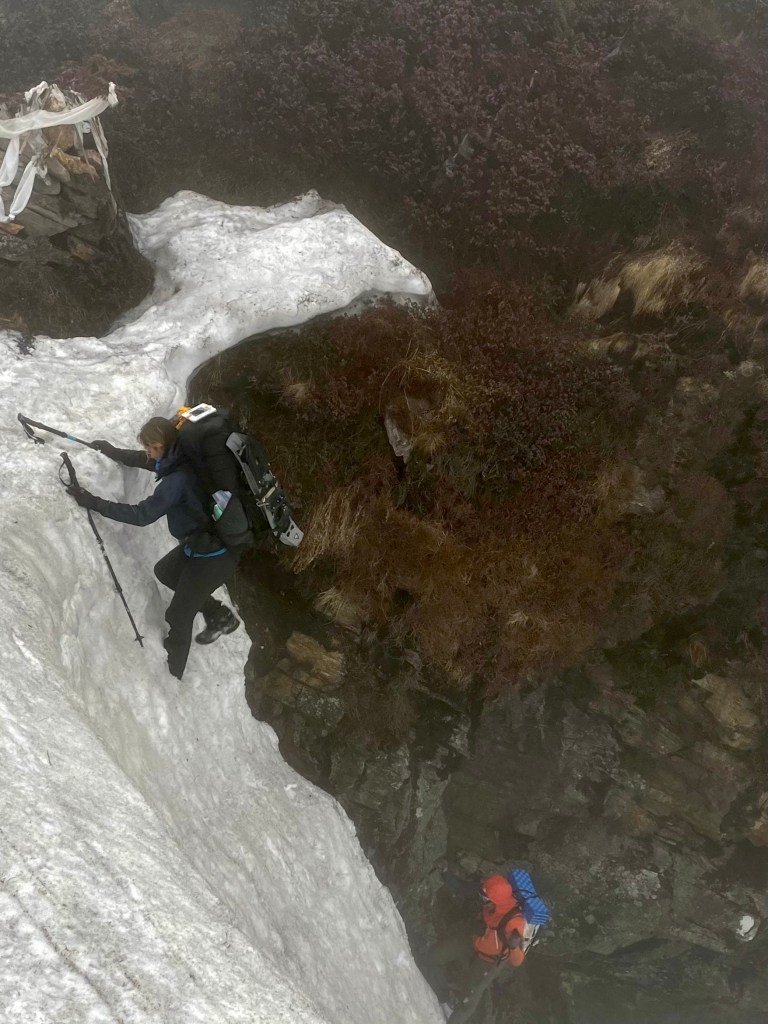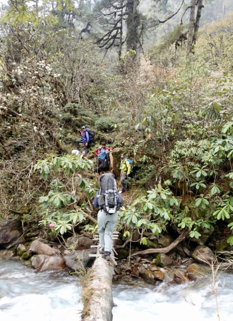 We crossed a slippery log across a raging stream and started our climb towards cave camp in a light drizzle. Our porters feared the camp we were looking for would be buried in snow. As the trail turned into a snow filled gully that was clearly an avalanche path we had to start thinking about alternative camping options.