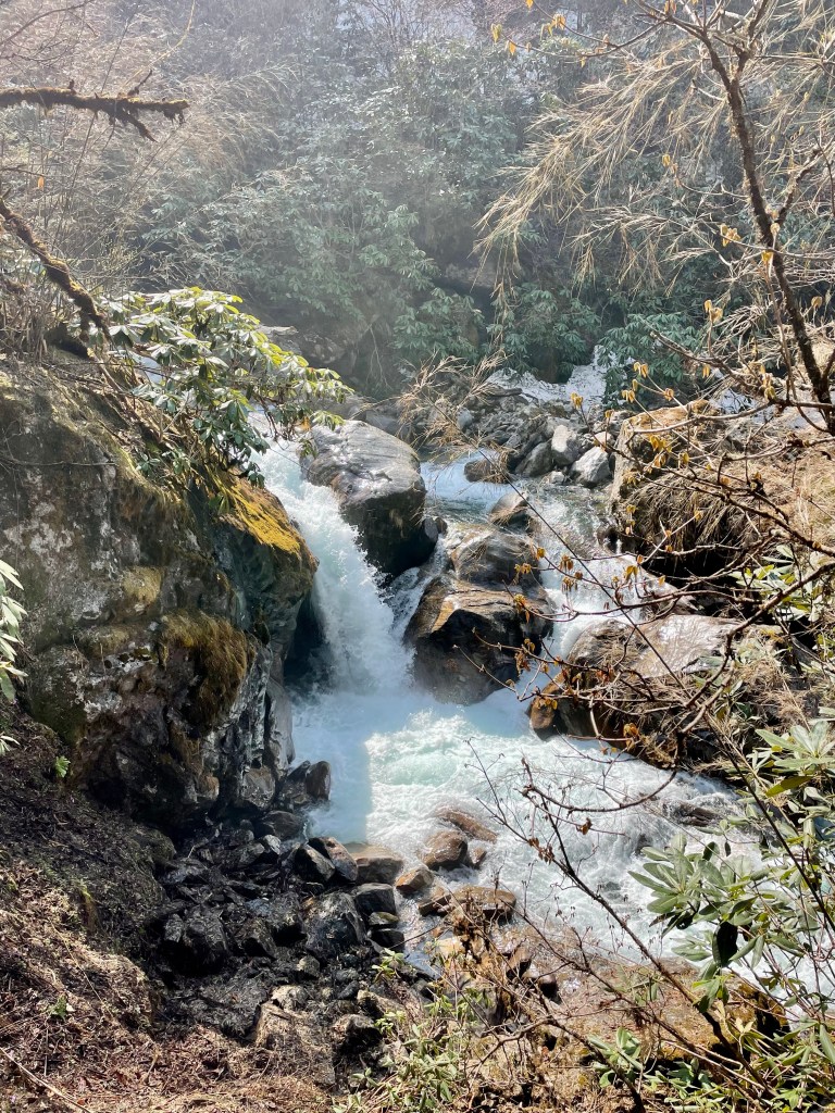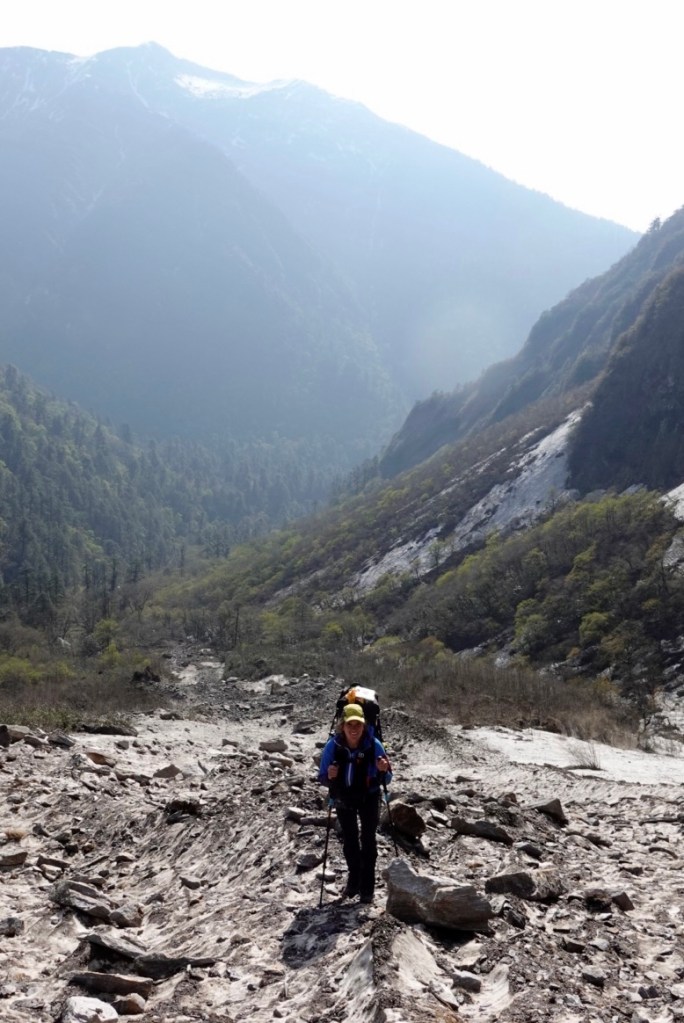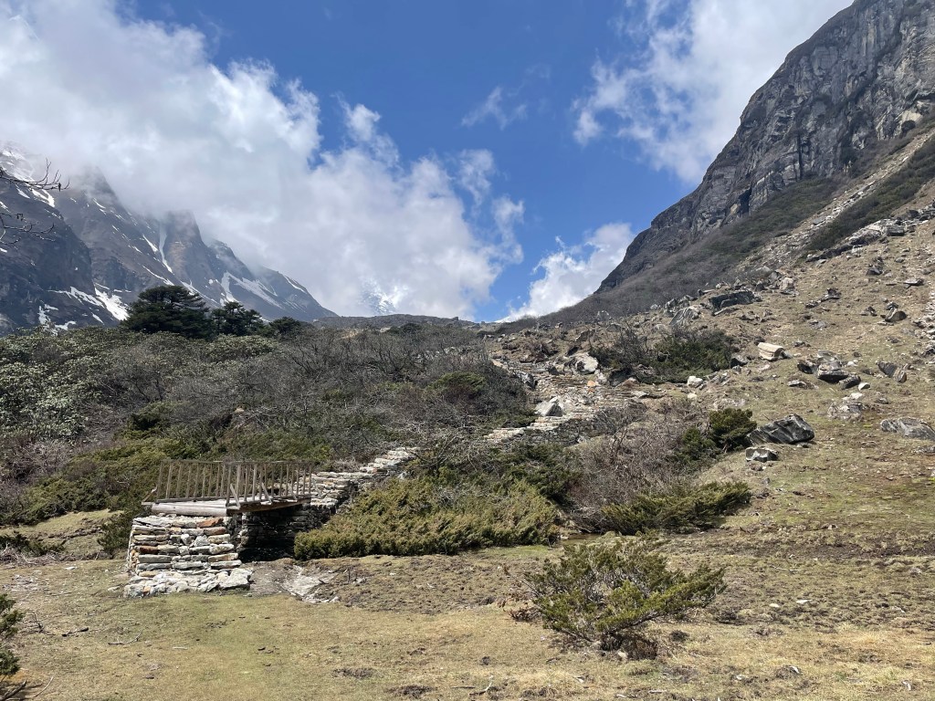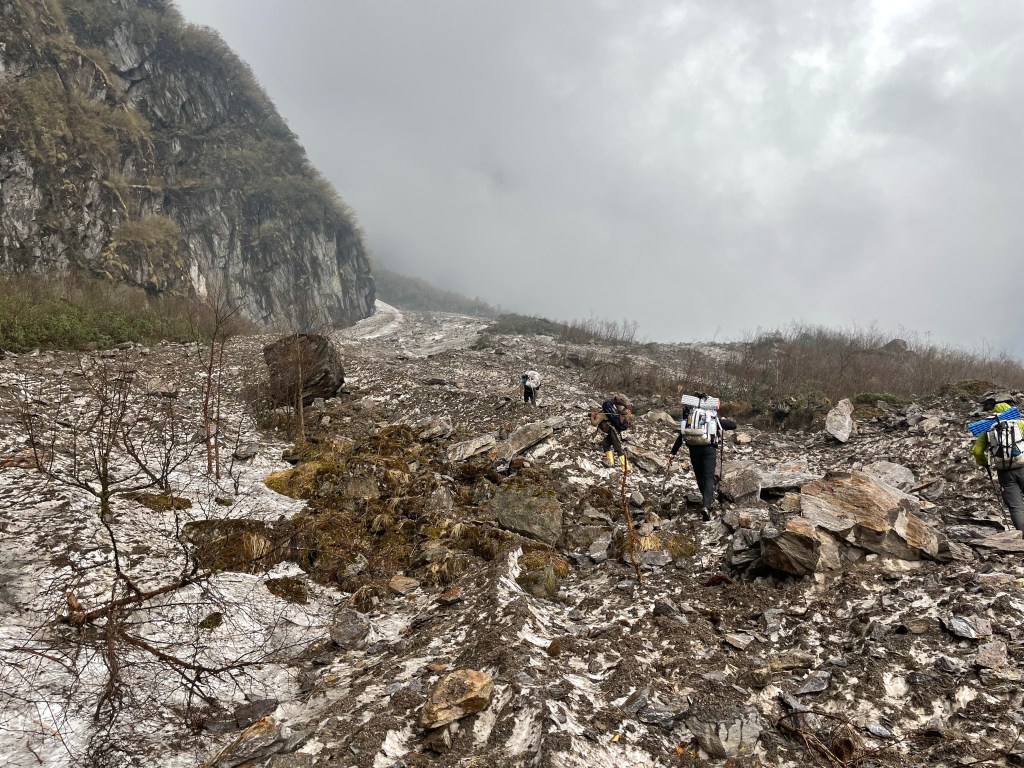 After reaching our high point we actually found some section of uncovered trail. After a few steep steps we were out of the snow. Finally reaching a nice kharka and the first structure we had seen in days we. From here the porters said it would be 4 or 5 hours to Yangle Kharka which would get us there just before dark so we pushed on. We descended quickly through a luscious PNW like forest to the river that flows out of Makalu’s glaciers. Then we worked our way upstream to Yangle Kharka.