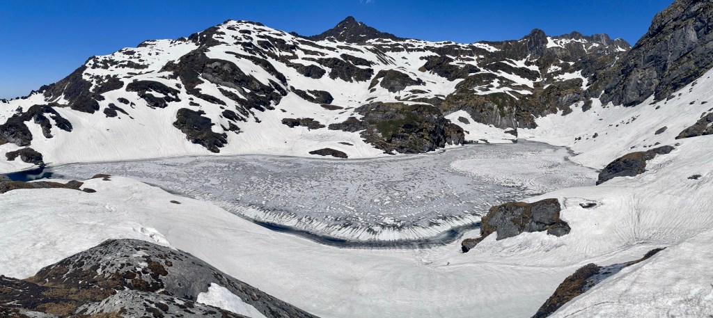 We woke to frozen rain on the tent and sun that couldn’t quite reach us because of the mountains. It was a slow start as we waited for the sun to dry our gear, so we enjoyed a leisurely morning.