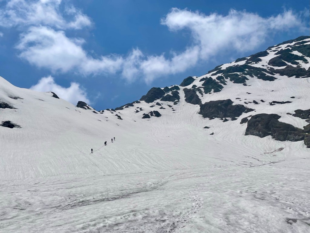 First we had to get around the lake safely, then it was another few thousand feet up to the pass. Nearly the entire day was spent on snow from the lake on. On the other side of the pass we quickly dropped several thousand feet glissading on the soft snow down what would have made some great ski runs. The snow line reached all the way down to the river and we found a kharka just downstream out of the snow.