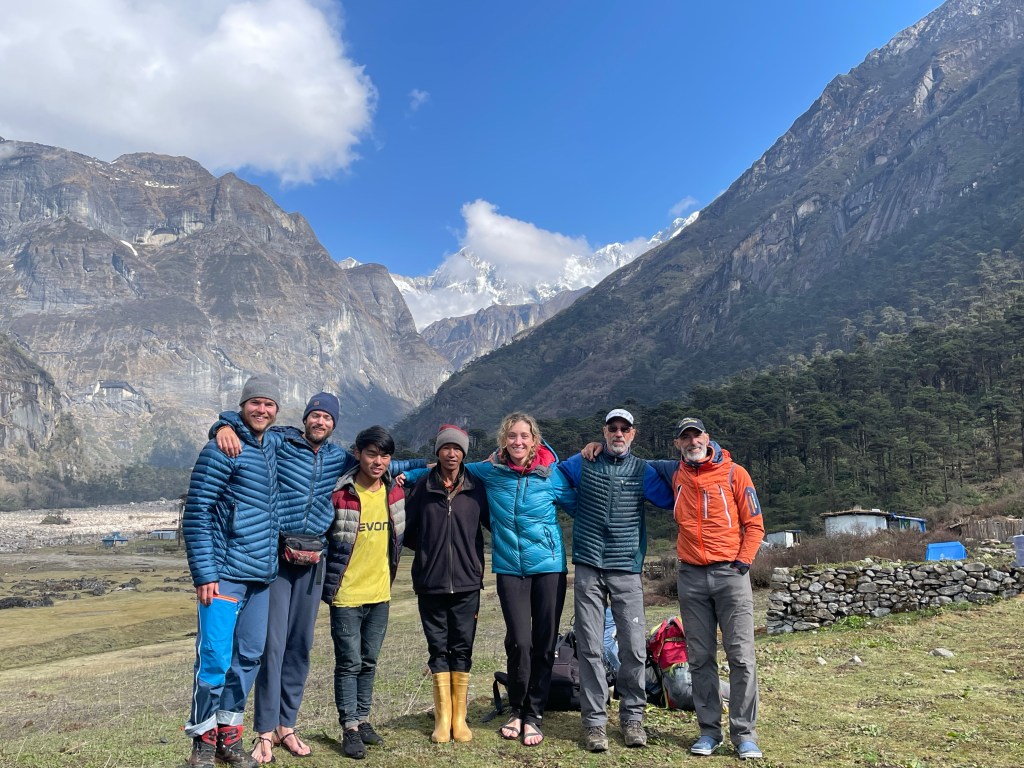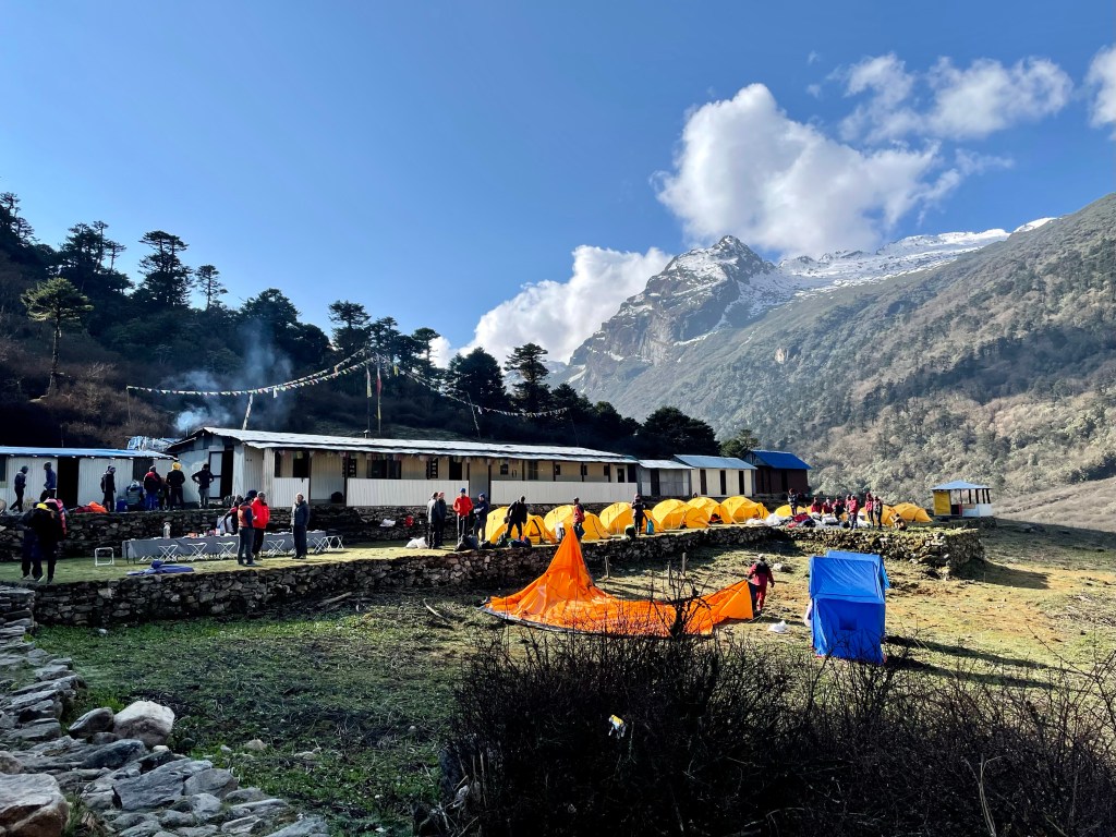 When we finally arrived to Yangle Kharka we were stunned by the number of people. There were 8 tents, including a mess tent lined up in front of the guest house with a large group of Brit’s coming back from Makalu Base Camp. Then another group of 6 Czech’s who were planning to do the same passes we were heading towards. Thankfully Gombu Sherpa, who has been helping with resupply movements, was there to greet us. It was nice to see his smiling face and to have him help us navigate the busy scene and get us a room and tea.