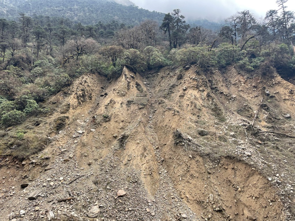 The trail was not done with us yet though. We hiked parallel to a 4 foot wide trekking trail across the river while the trail under our feet was literally starting to crumble. We began encountering landslides dropping straight into the raging river. Eventually we were jumping across steep loose water runnels and grabbing on to vegetation to stop from sliding down. Mingma was doing his best to make it safe, but his over zealous desire to help led him to grabbing Mike’s hand and launching him into the landslide bank. Mike coined the nickname for him, “Mr. Muscles.”With bloody knees and knuckles, Mike caught up to us. Mingma stated “one more danger section.” Luckily he was right, and once we passed it we met up with the main Makalu trekking route.