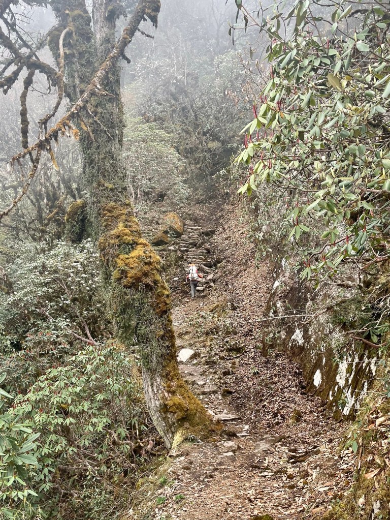 Most of the hiking over Shipton La was in the snow until we got down below 13,000 ft. The stone path and stairs were reminiscent of a miniature Great Wall of China as we winded our down the ridge. In Kongma Danda we met the better half of the guest house owner in Dobate. She got us some water and told us to stop in and see her daughter, Pasang, in Tashigoan. We became acutely aware we had entered the jungle again when we started getting swarmed by no-see-ums during our breaks. Even then we still enjoyed being back in the forest full of plants and mushrooms we had never seen before.