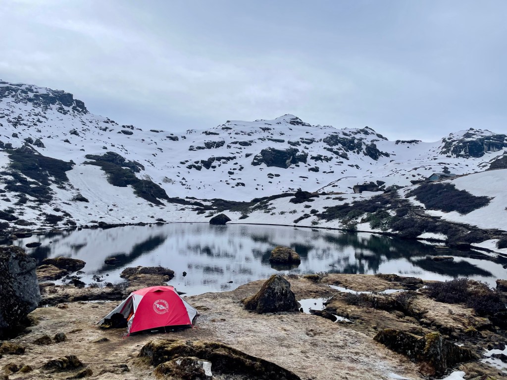 We told them we were planning on stopping at the lake to camp, so as the clouds moved in and rain picked up we held back. Much of the hiking was in the snow and it was nice to have footprints to follow for once. Once we reached Kalo Pokhari we hung out in a shelter to avoid the heavy rain. We spent an hour unsuccessfully starting a fire in the shelter until the rain stopped. Then we quickly set up camp and enjoyed our first night back home in our tent.
