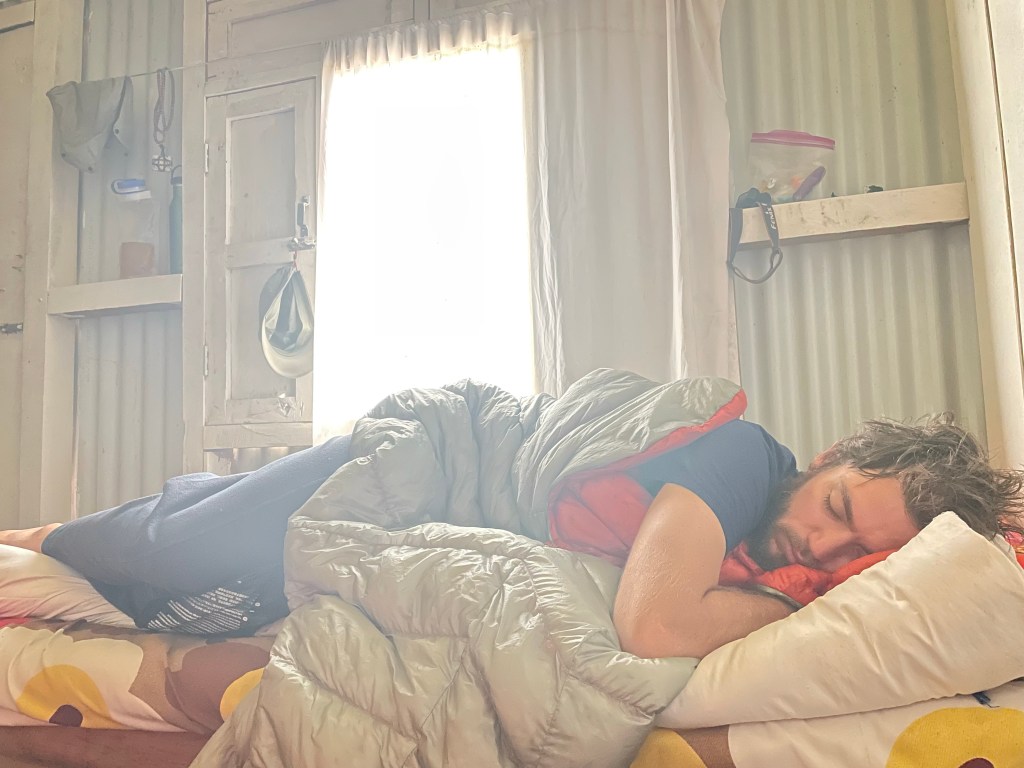Tom was drawn to an overhang on the cliff which ended up being cave camp. It was protected by rockfall and had some flat snowy spots so Tanner and ourselves pitched our tents there. The porters and Matt spotted a large boulder out of the snow and few hundred feet up. It had a decent overhang so Matt, Mike and the two porters decided to stay under it together.