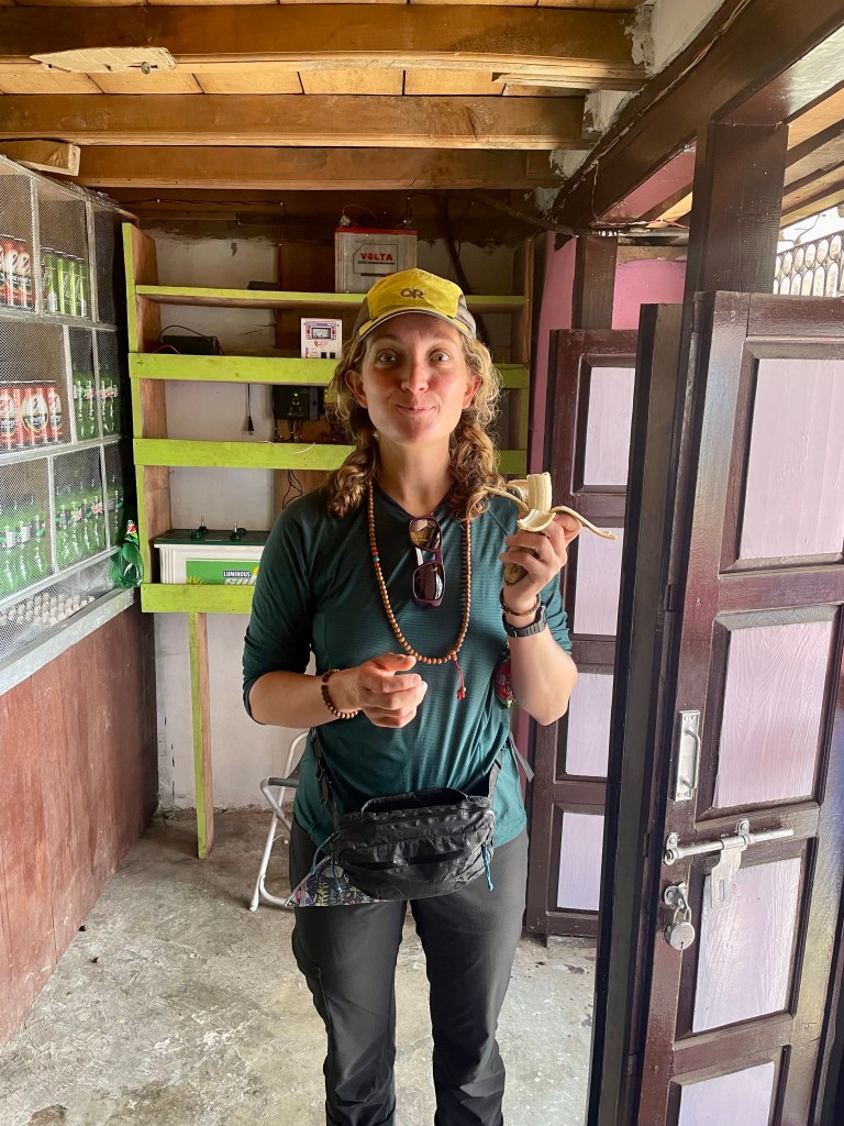 Knowing the hike to Num was only a few miles we slept in. The sun was out and the guest house was bustling. The guy the from the night before was giving Tungna lessons, kids were playing under the tables and the family was busy doing their chores. We indulged in coffee and had the best trail pancake we’ve had. Dolma gave us some bananas then we were off heading down through the village just before 10 am.