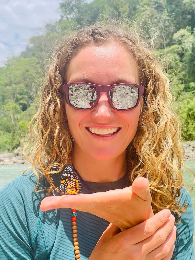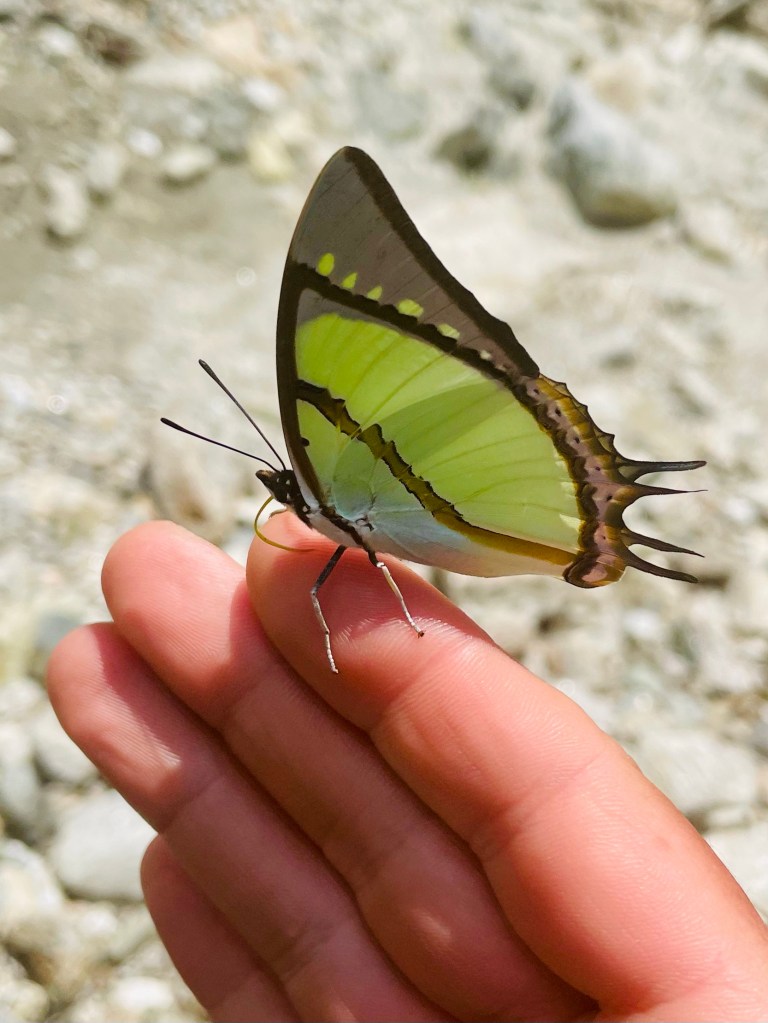 We were so sweaty by the time we reached the river that we had to take a dip. Not to mention it had been over 2 weeks since our cold water spigot rinse in Hongon. After we bathed in a little hole next to the raging river we discovered butterflies were covering our clothes laid out in the sun. There must have been over a dozen different varieties surrounding us. Their color was so spectacular we couldn’t take our eyes off of them.
