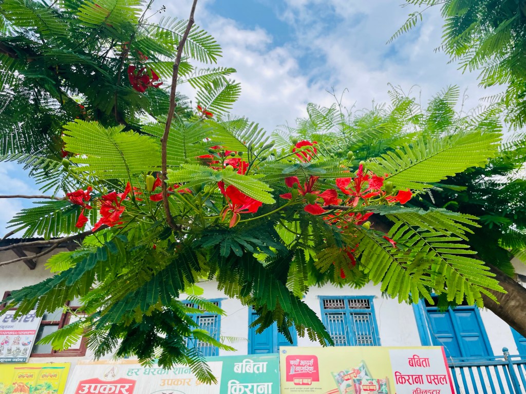 Gulmohar tree also known as a royal poinciana tree. Wow!Phewa LakeRooftop views from the hotel Colorful wood doongas lined the shores.