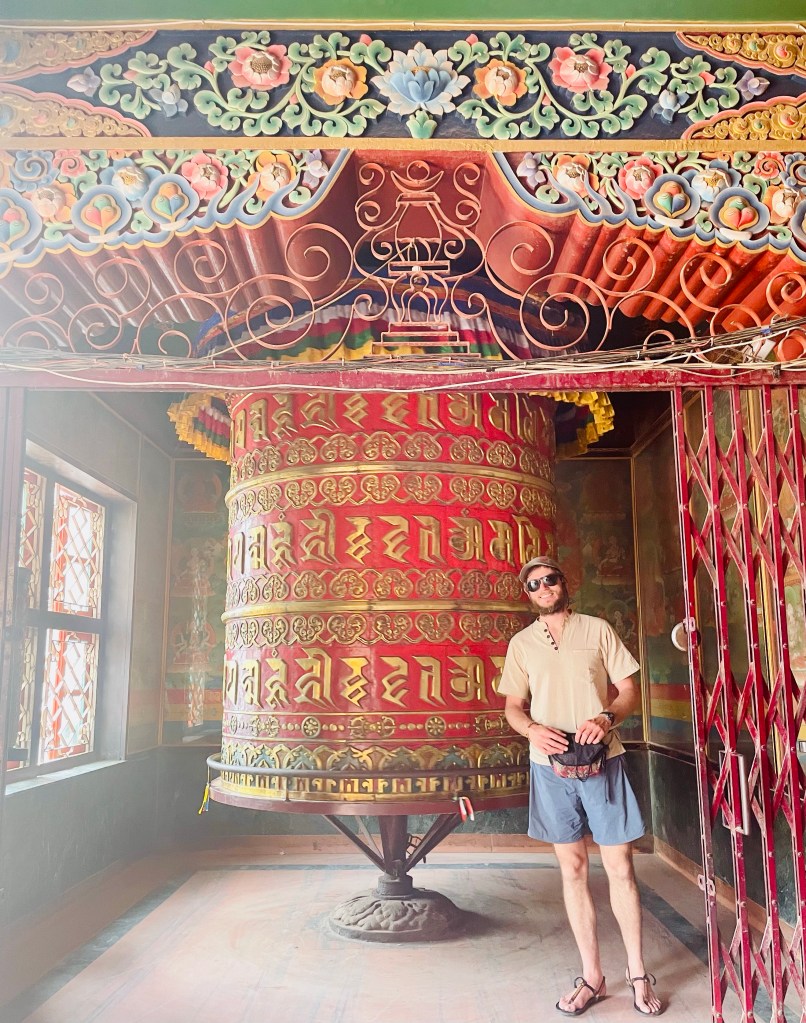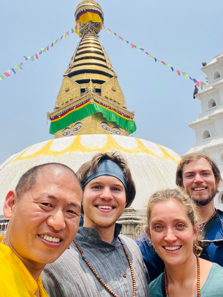 Our friend, Tsering, set up a time for us to meet his guru Serkong Dorjee Chang Rinpoche. Tanner joined as we walked to Swayambhunath, a Buddhist temple complex that sits atop a large hill in the middle of the city. The Rinpoche’s monastery and school are located on the grounds of the temple. Rinpoche, previously Tenzin Ngawang Tsültrim Dönden, shared that at just 3 years old, he knew he was the third reincarnation of Rinpoche. In 1985 he was recognized by H.H. the 14th Dalai Lama.