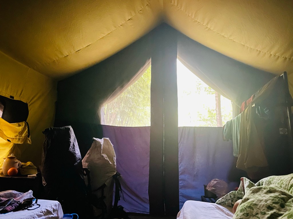 We arrived at The Last Resort after 8 hours, grateful we had been in a jeep after we saw buses filled to the brim with people all over the roads. Although ‘resort’ is in the village’s name, we had not expected an actual resort so we were pleasantly surprised by the swankiest accommodations yet. The grounds were manicured with detail as if we were at a retreat center and the paths would light up at dark. The bathrooms had actual sit down toilets, stocked with toilet paper, working lights, and large showers with warm water. There were spacious glamping tents on stone platforms, a nice outdoor bar and dining area, and a beautiful plunge pool that we quickly submerged ourselves in. This area is a frequently visited weekend getaway with bungee jumping, canyoneering, and river rafting. Knowing that we would soon be in the mountains and jungle we embraced the relaxing getaway.