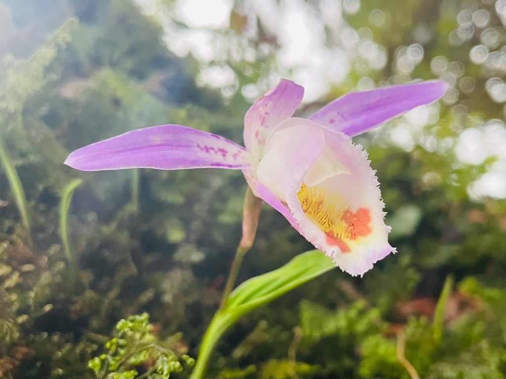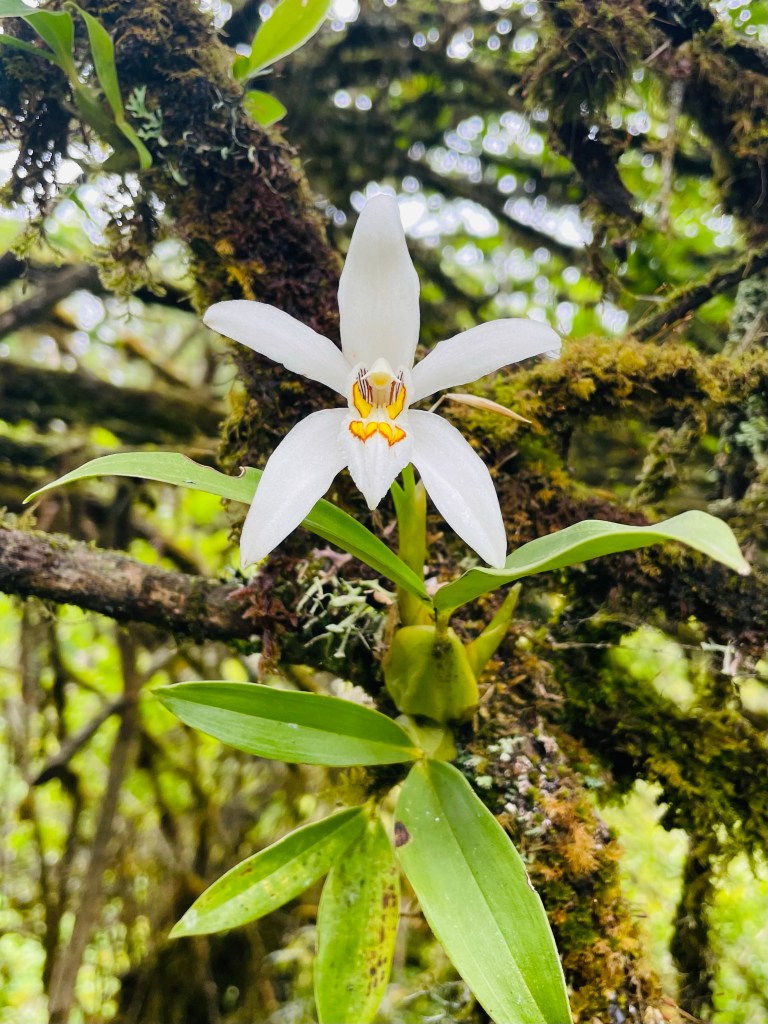 Orchids were growing out of moss patches all along the trail on an unidentified tree.Our tents seen across the way, the main village below and out of sight.
