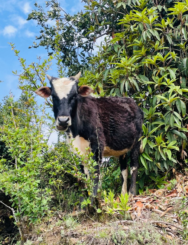 We headed back down to pack up our tent and find the trail to Kyansin. Just as we headed out of camp Tom noticed a Dzokyo had just given birth to her calf. Her placenta was still emerging and she was licking the shivering little calf clean as we walked by. To see the cycle of life occurring on a cold rainy mountainside morning brought some perspective. The moment was magical.