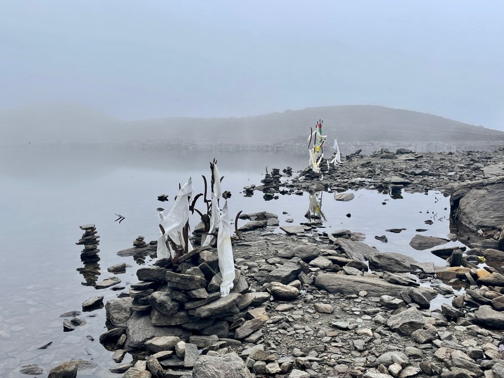The lake is at an altitude of 14,000 feet and surrounded by craggy mountainsidesTridents erected out of the rocks.Sarah built a cairn for her Khada Spigots designed so holy water can flow out and bath visitors