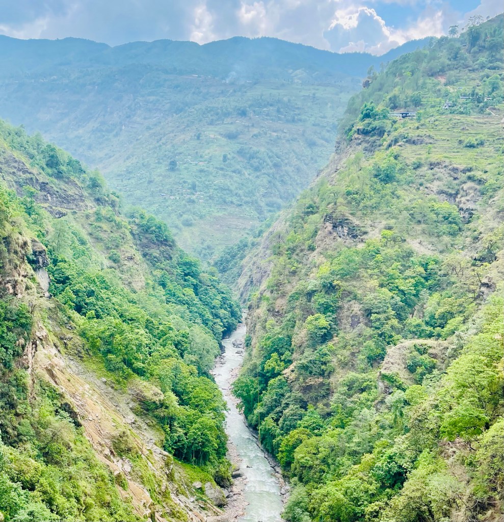 As we went down we saw a lot of mule trains and locals heading up the trail. One of our favorite parts of trekking has been seeing all the locals on their home trails doing their usual commutes. We feel like little kids curiously observing every little thing we see; how they plant their gardens and layout the farms, how they bring everything they need up and down the steep difficult trails, and how families will carry or take their kids between villages. The trail we were on was the main route between Seduwa and Num, it went down and up 3,000 ft crossing a river valley.