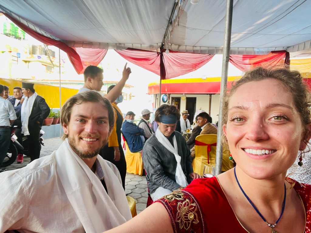 When we walked into the wedding we were all blessed with a khada. As we looked around for a table we realized Sarah was the only one in a sari. And yes, there was an obvious dress code for the ladies that we missed. Turns out this was a Tibetan Buddhist wedding which has a very different style of attire. Both are common in Nepal. After a good laugh and many stares in our direction we got ready to celebrate.