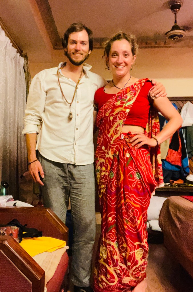 We found a store filled with colorful fabric adorned with mirrors and sequins. Two kind men were up to the task and helped piece together a red sari. They brought us tea as they sewed a new button on the shirt. Then one of the men wrapped Sarah in the long sari and pinned it in place. We hustled back to the hotel while Sarah struggled to walk in the new contraption.