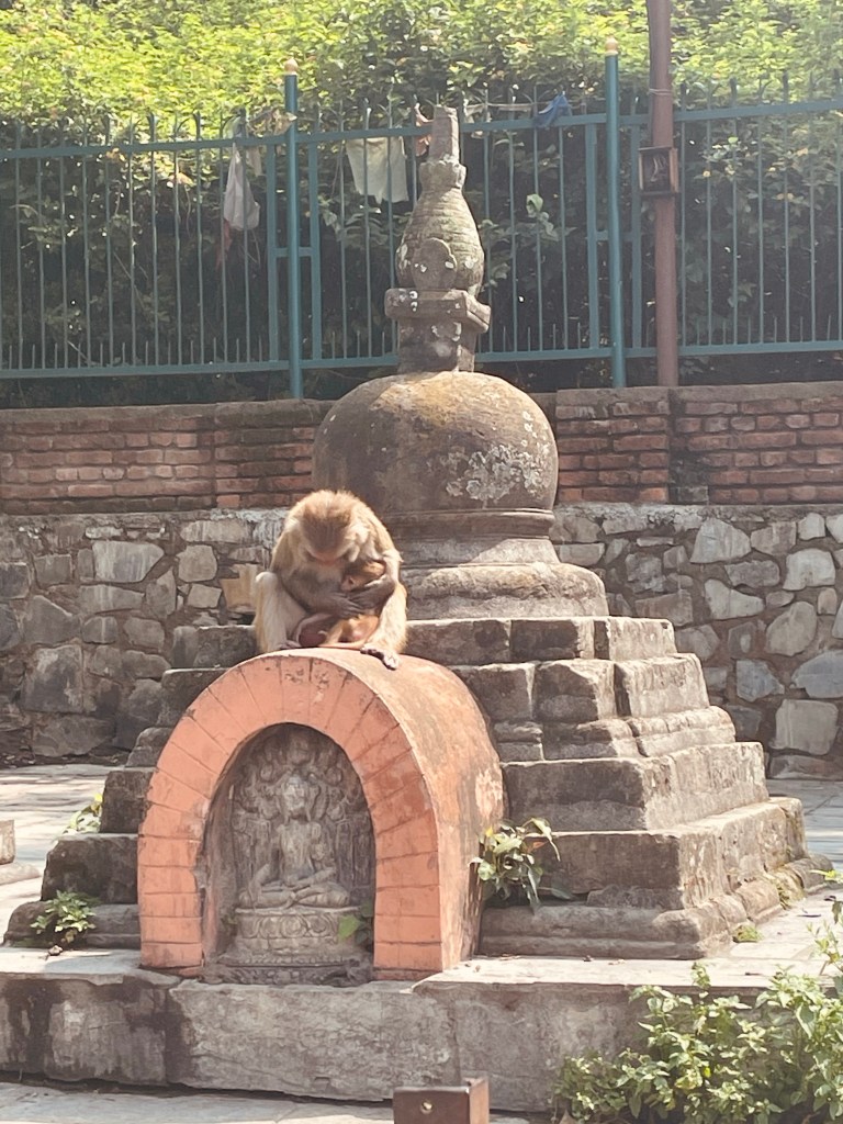 At the very top of the hill is the large Swayambhu stupa which represents the womb of creation. Serkong Rinpoche showed us one of his favorite ways to give our Khada blessings to the gods by wrapping a small rock up in the scarf and chucking it up high onto the stupa.